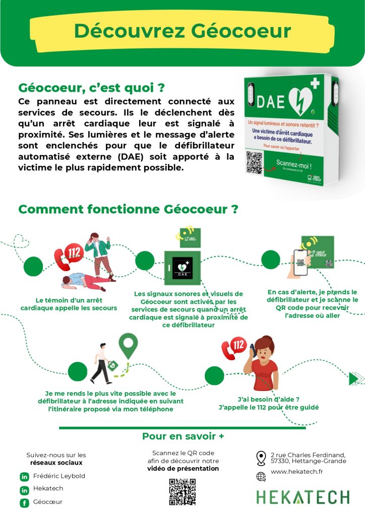 - Comprendre le fonctionnement du dispositif Géocoeur, un panneau connecté qui alerte les passants lors d’un arrêt cardiaque à proximité et qui est équipé au sein de la commune.